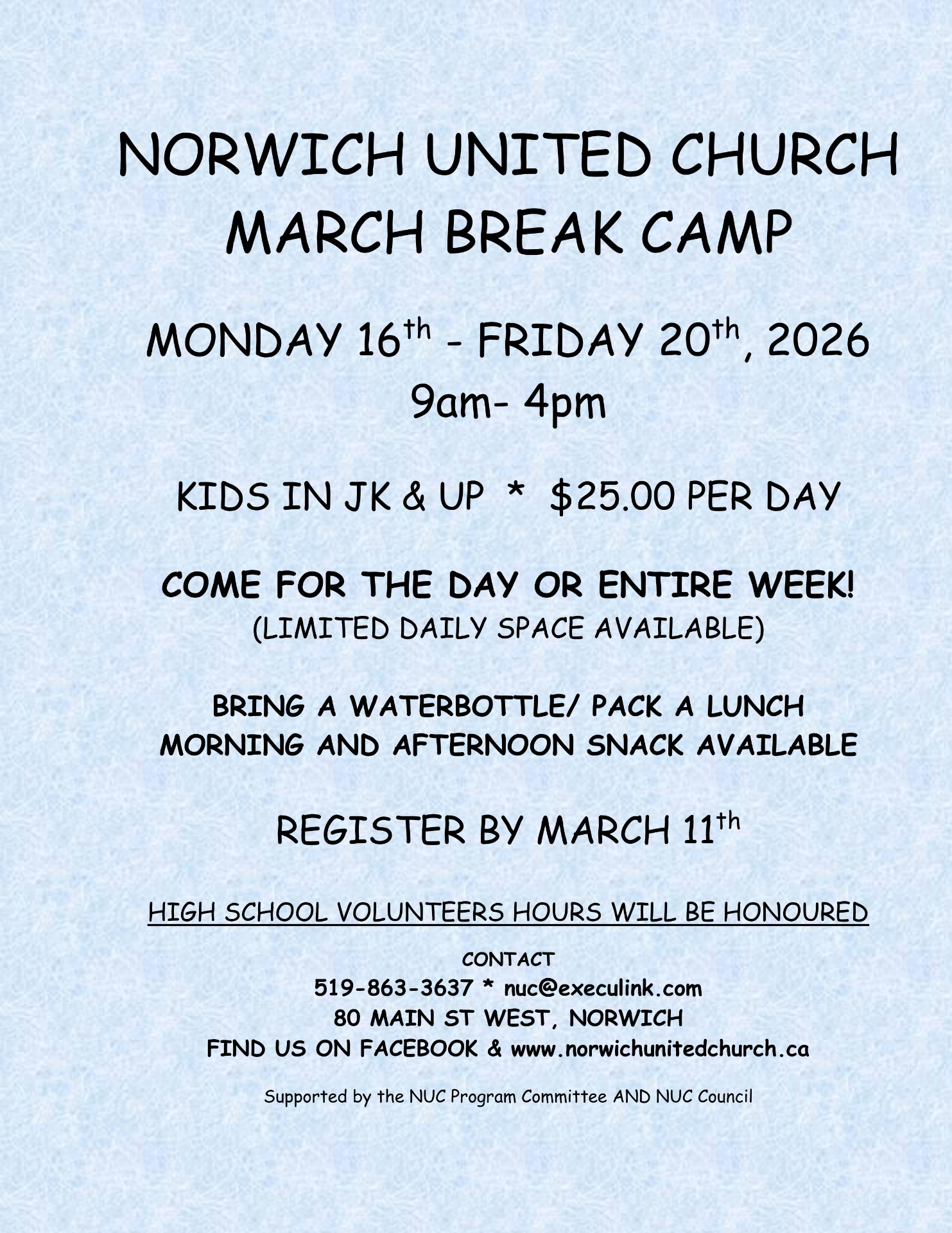 Simply write out a cheque to Norwich United Church, Box 183, Norwich ON N0J 1P0. You may post-date your cheques to a date that is convenient to your banking needs.