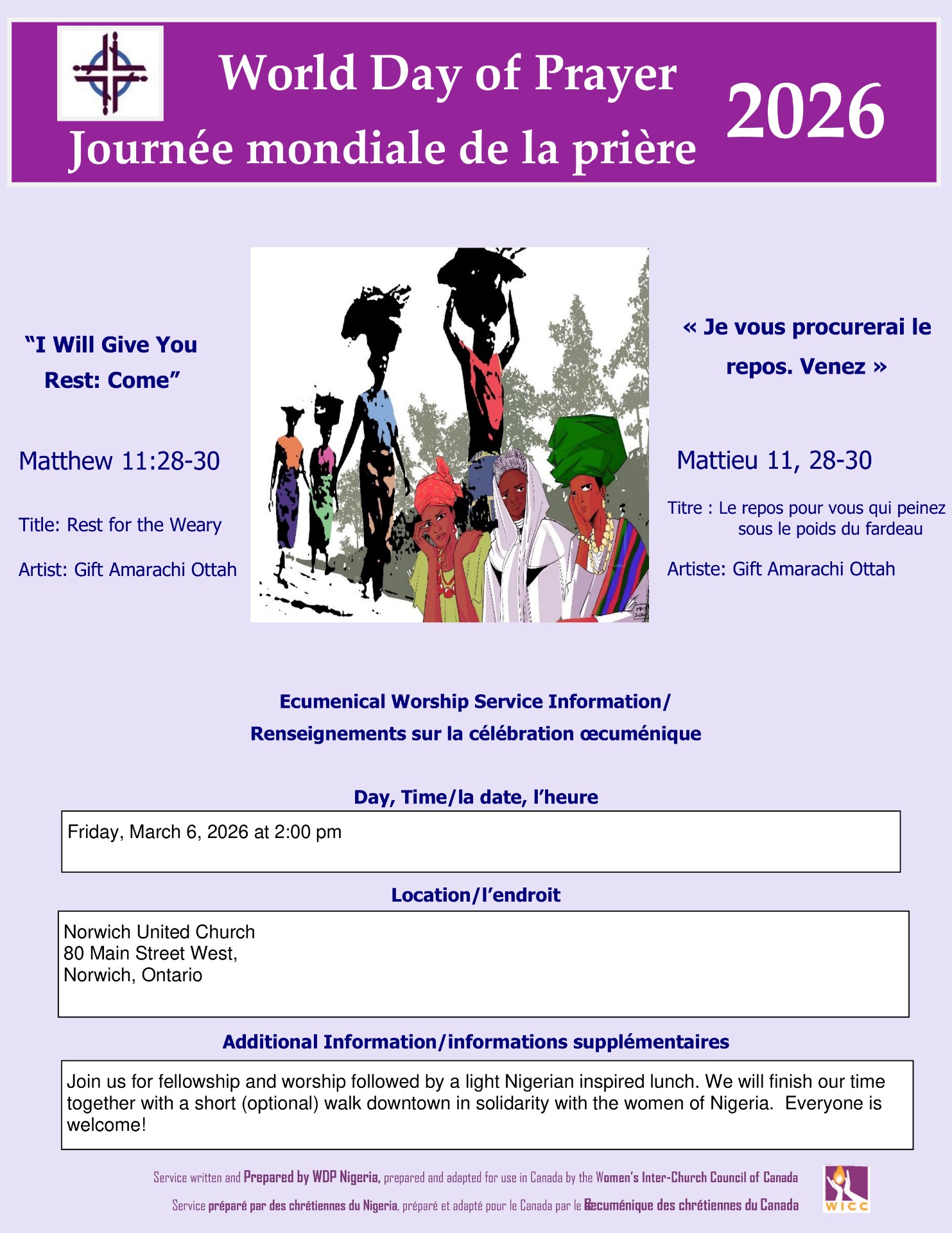 Friday, March 6th at 2:00 pm. This ecumenical service has been prepared by the women of Nigeria for World Day of Prayer.